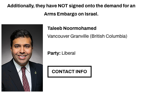 This is our critical opportunity to stop the flow of weapons and force the government to close this legal loophole once and for all. It's time to push MPs, including Taleeb Noormohamed, to pick a side: Will they continue to funnel unrestricted and unregulated arms to Trump’s illegal wars, ICE’s campaign of terror, and Israel’s ongoing genocide? Or will they listen to the Canadian public and ensure that Canadian military exports are aligned with international law?