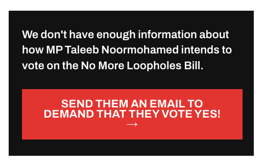 The No More Loopholes Act will go to a vote in Parliament at the end of February. The critical window to act to pressure MPs to vote for it is right now.
