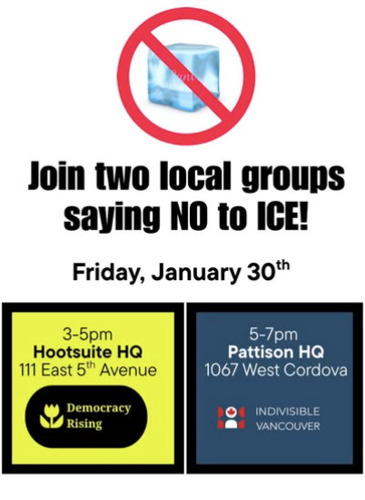 This Friday: Two Vancouver groups, two locations, one message. Canadian companies have no business working with ICE. Join us. 🚫🧊