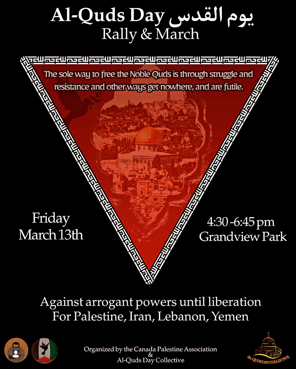 We call upon the masses, the workers, the students, and the free people of the world to flood the streets under the sacred banner of Al-Quds. Let the world witness our unwavering solidarity with the people in Palestine, in Lebanon, in Iran, Yemen and their defiance against US-backed terror. We march here on Turtle Island and in solidarity with our Indigenous comrades on unceded lands to sever the hand of the occupier and to affirm that Palestine will be free, from the river to the sea. Unite with us this Friday, March 13th, at 4:30 PM. Let your voice join the thunderous roar of the global intifada. The liberation of Al-Quds is inevitable, and it begins with our feet on the ground!