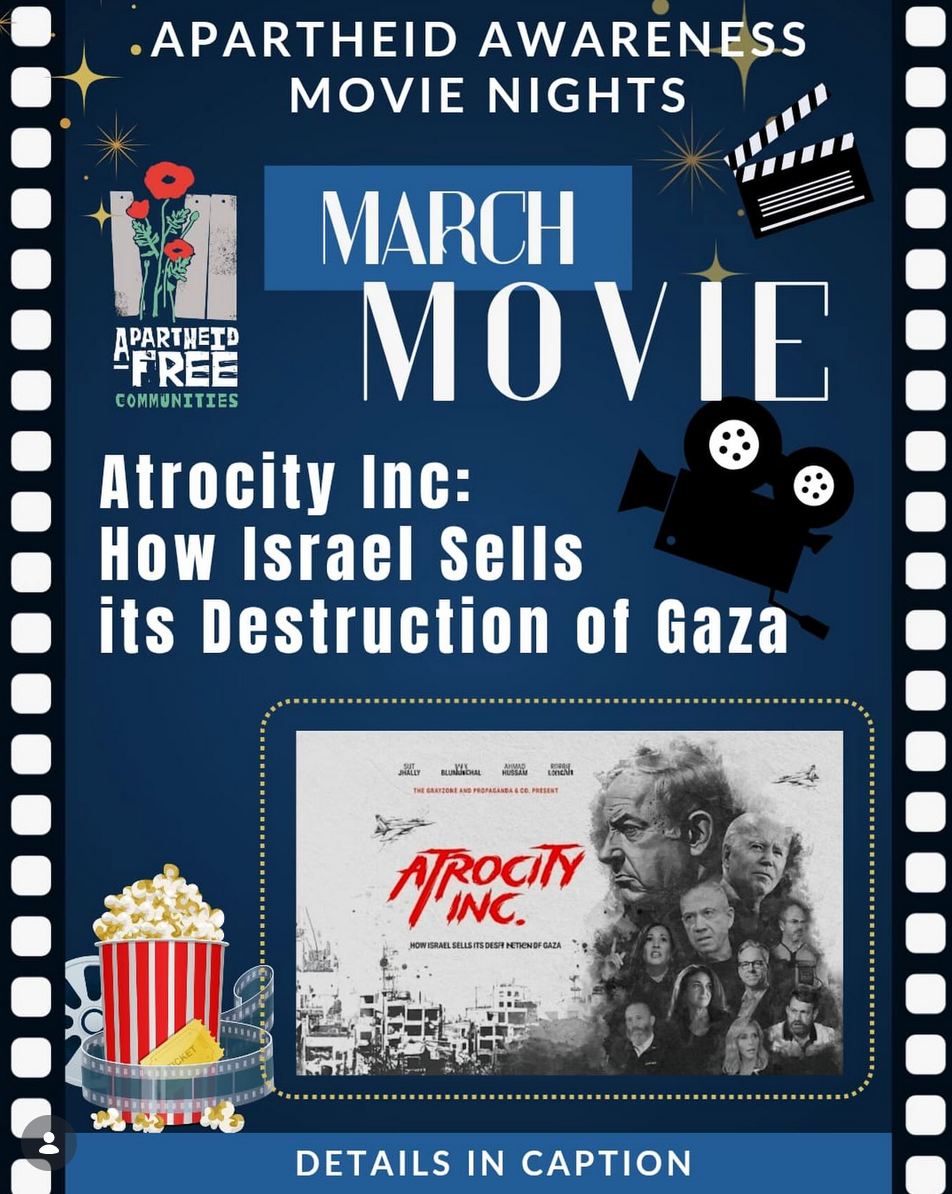 “Atrocity Inc: How Israel sells its destruction of Gaza” will be the first film in the Apartheid Awareness Movie Nights series.